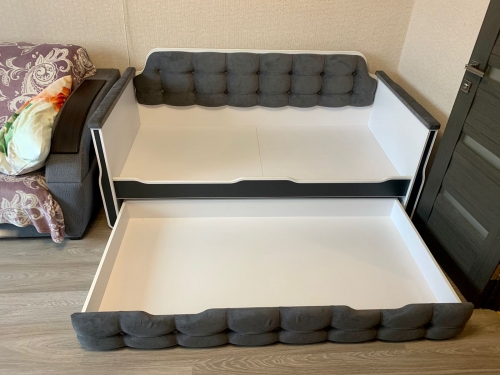 Витринный образец. В отличном состоянии. Исполнение в премиальном вельвете Velvet LUX. Кровать с бельевым ящиком, который можно использовать, как дополнительное спальное место.