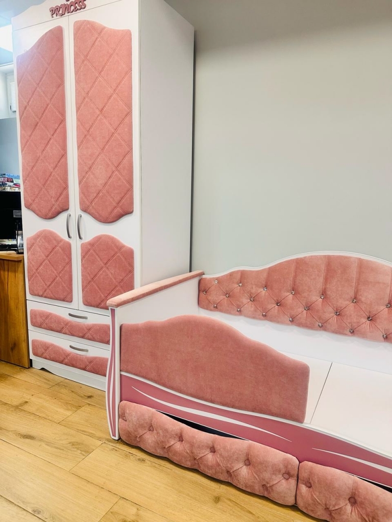 Шкаф с ящиками "Иллюзия" с направляющими и доводчиками .Корона шкафа украшена надписью Princess. Обивочная ткань шкафа Velvet lux 15 из премиальной коллекции.