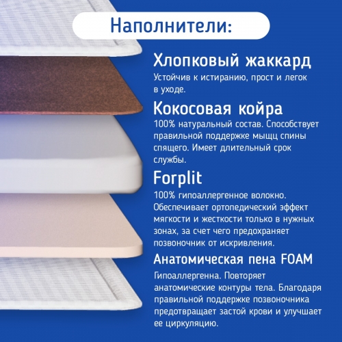 В основе матраса холлофайбер, который обеспечивает равномерное распределение веса и придает матрасу достаточную мягкость и упругость.