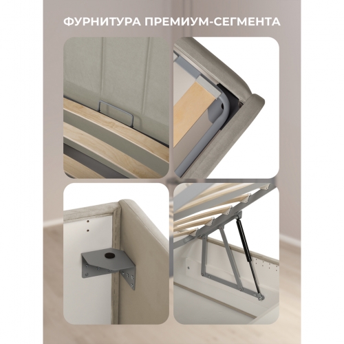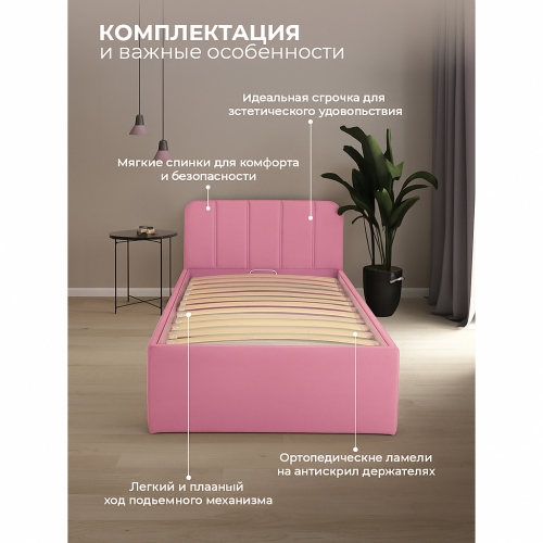 Кровать изготовлена из ЛДСП класса эмиссии 0,5. Ортопедическое основание состоит из металлического профиля с защитным покрытием. Обивка из износостойкой ткани мягкая на ощупь и легко чистится. Благодаря своему стильному дизайну кровать впишется в любой интерьер.