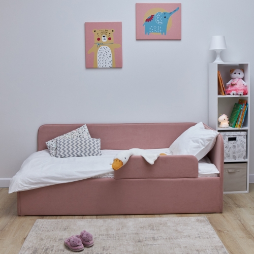 Обивка из приятного велюра не только добавляет стильный акцент в интерьер, но и обеспечивает легкую чистку, что особенно важно для детских комнат. Износостойкая ткань гарантирует долговечность и сохранность внешнего вида кровати на протяжении многих лет.