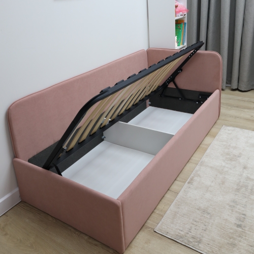 Кровать имеет надежное реечное основание, которое обеспечивает правильную поддержку матраса и способствует здоровому сну. Уникальный подъемный механизм позволяет легко поднимать матрас, открывая доступ к вместительным ящикам для белья, где можно хранить игрушки, постельное белье и другие вещи, сохраняя порядок в комнате.