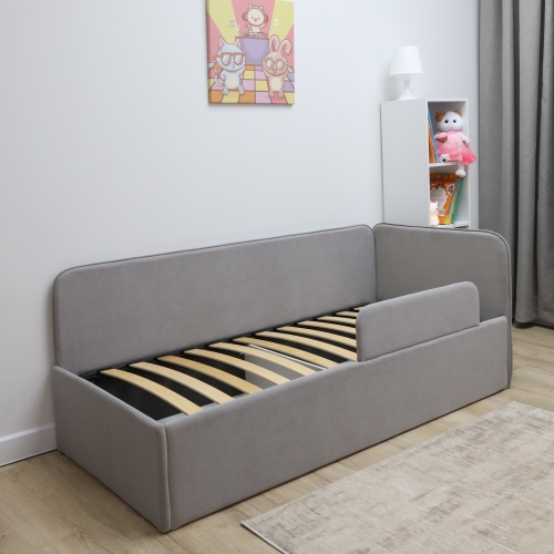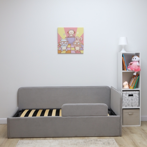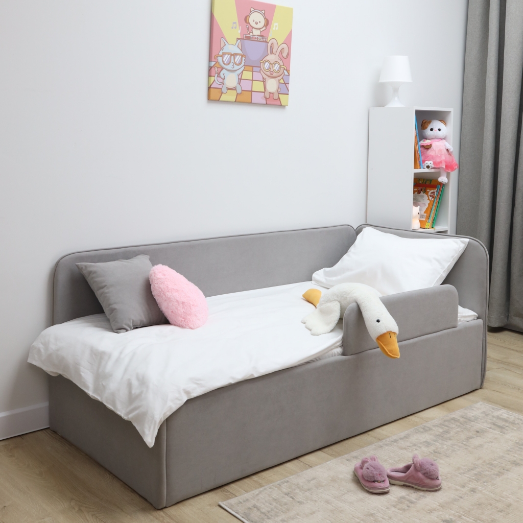 Обивка из приятного велюра не только добавляет стильный акцент в интерьер, но и обеспечивает легкую чистку, что особенно важно для детских комнат. Износостойкая ткань гарантирует долговечность и сохранность внешнего вида кровати на протяжении многих лет.