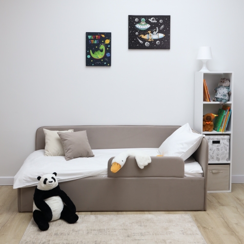Обивка из приятного велюра не только добавляет стильный акцент в интерьер, но и обеспечивает легкую чистку, что особенно важно для детских комнат. Износостойкая ткань гарантирует долговечность и сохранность внешнего вида кровати на протяжении многих лет.