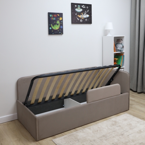 Кровать имеет надежное реечное основание, которое обеспечивает правильную поддержку матраса и способствует здоровому сну. Уникальный подъемный механизм позволяет легко поднимать матрас, открывая доступ к вместительным ящикам для белья, где можно хранить игрушки, постельное белье и другие вещи, сохраняя порядок в комнате.