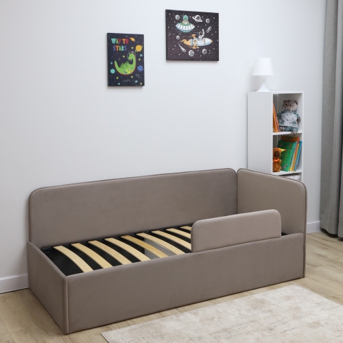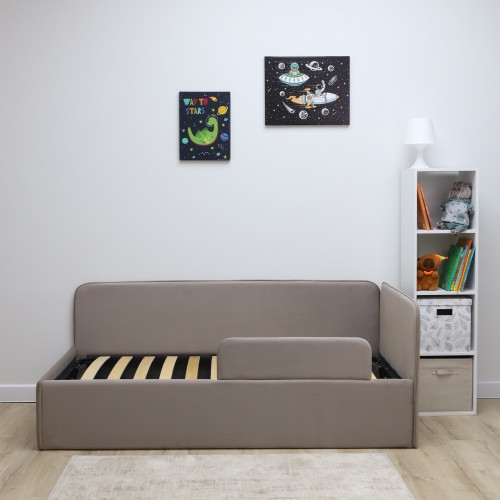 Обивка из приятного велюра не только добавляет стильный акцент в интерьер, но и обеспечивает легкую чистку, что особенно важно для детских комнат. Износостойкая ткань гарантирует долговечность и сохранность внешнего вида кровати на протяжении многих лет.