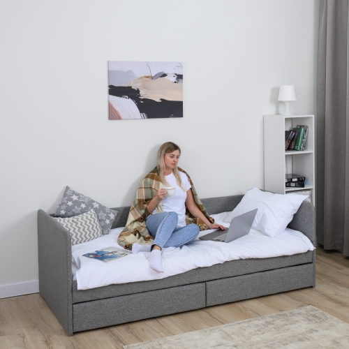 • Высококачественные материалы: Мягкая рогожка придаёт кровати роскошный вид, а прочный деревянный каркас обеспечивает долговечность и надежность.