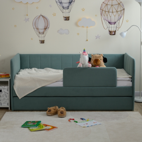 Кровать Полли оснащена вместительным выкатным ящиком, который поможет организовать пространство и удобно хранить игрушки или постельное белье. Изготовленная из качественного микровелюра, она не только привлекает внимание своим элегантным дизайном, но и гарантирует комфортный сон.